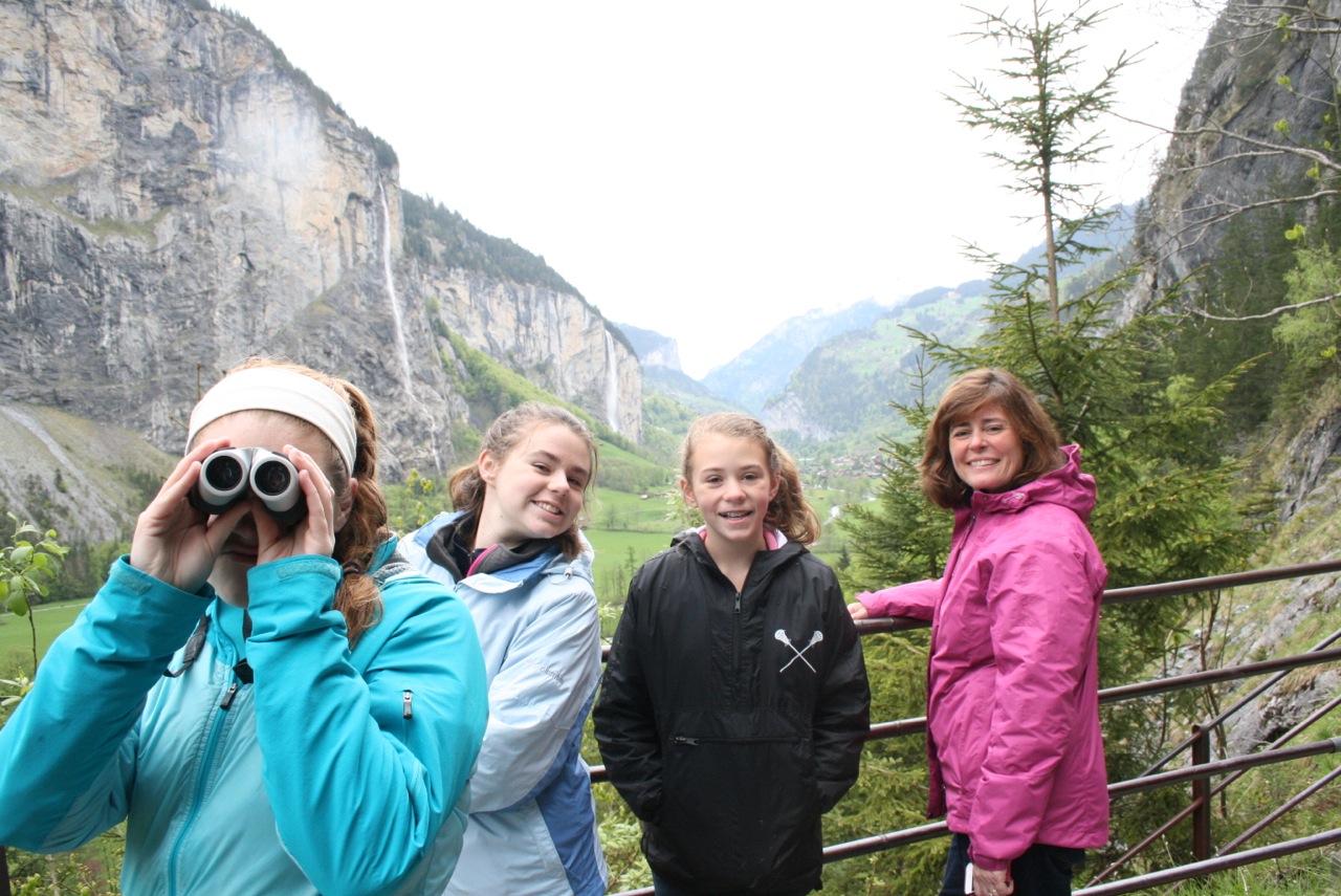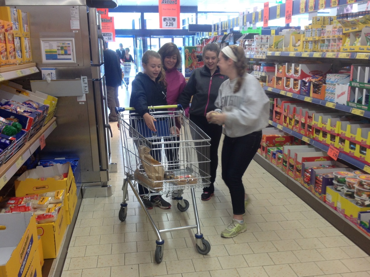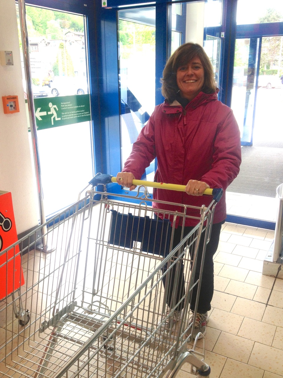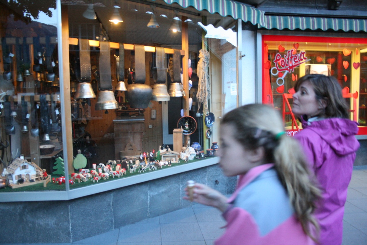 From the falls we headed into Interlaken for a quick trip to the grocery store. We show Kathleen here with the cart because it was a 20 minute ordeal for her to get the cart into the store. The grocery carts are chained together with individual chains that connect to the one behind it. There must be a terrible theft problem for these carts. Perhaps people use them as chair lifts to climb mountains, or as boats to get across the lake. Maybe the local teenagers use them to race down alpen cliffs… Whatever the case may be, after pushing and pulling and asking and watching we learned that you have to put a coin into a small, almost invisible slot in the handle. The coin disengages the chain, and you can roll the cart away. Which, by the way, has swivels on all four wheels – way nice! When you return the cart and push the chain connector back in, your coin is then able to be removed…. Clever, those Swiss. They should try their hand at watches, too….