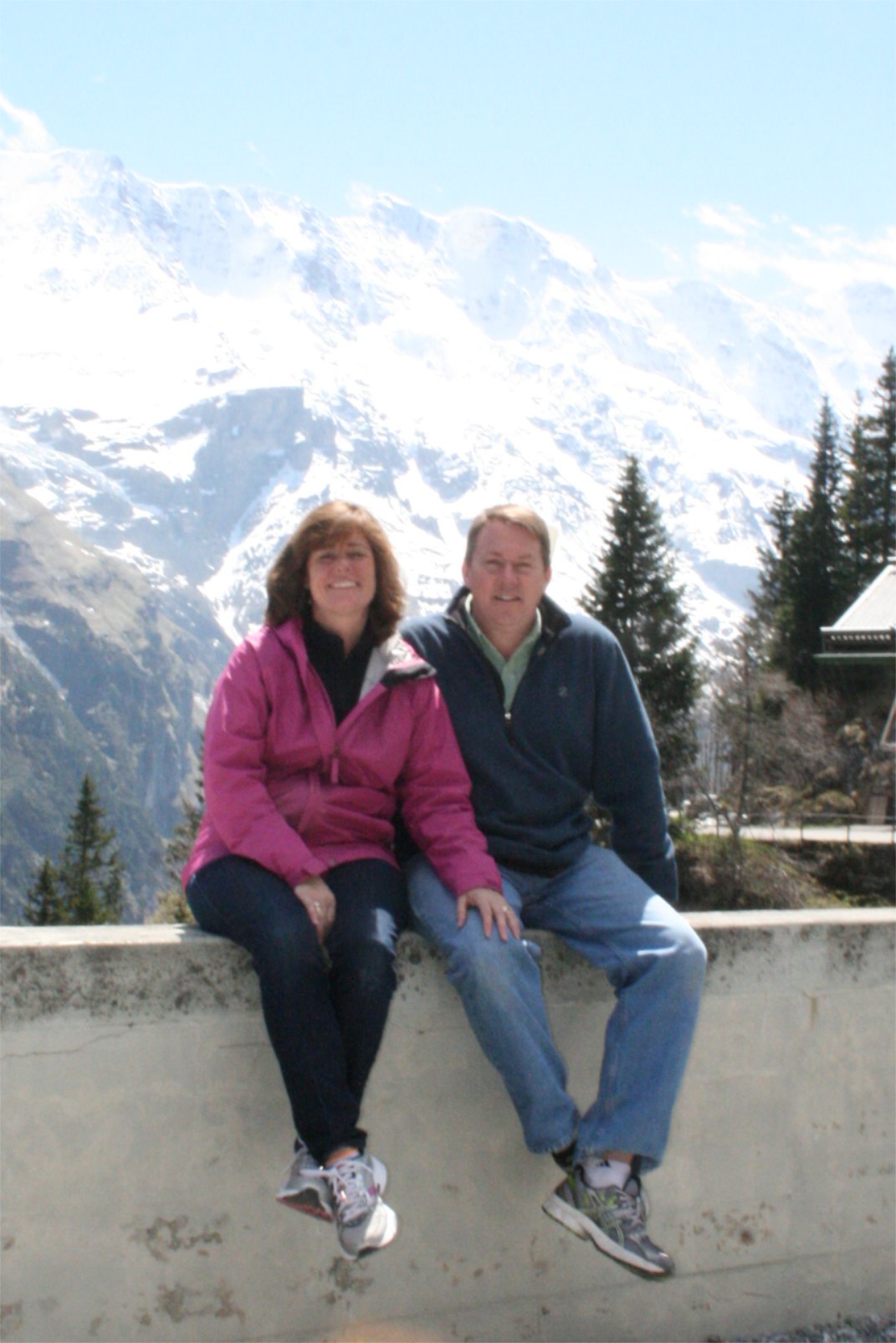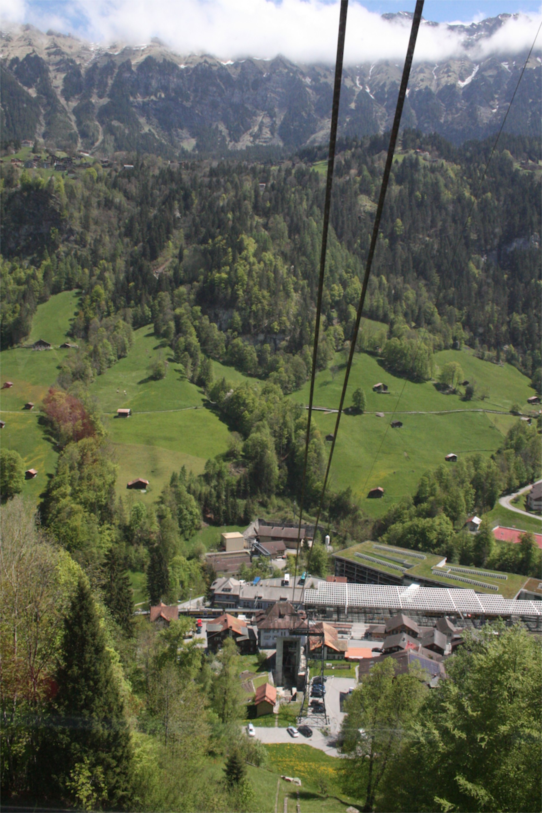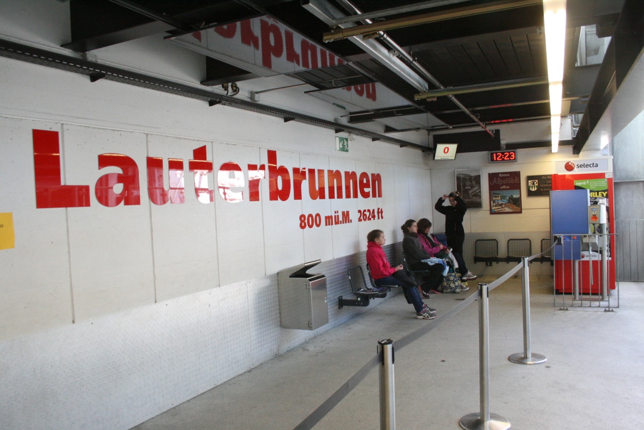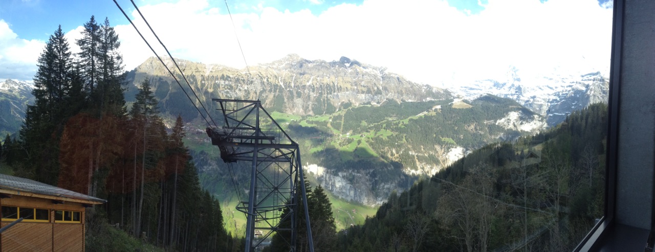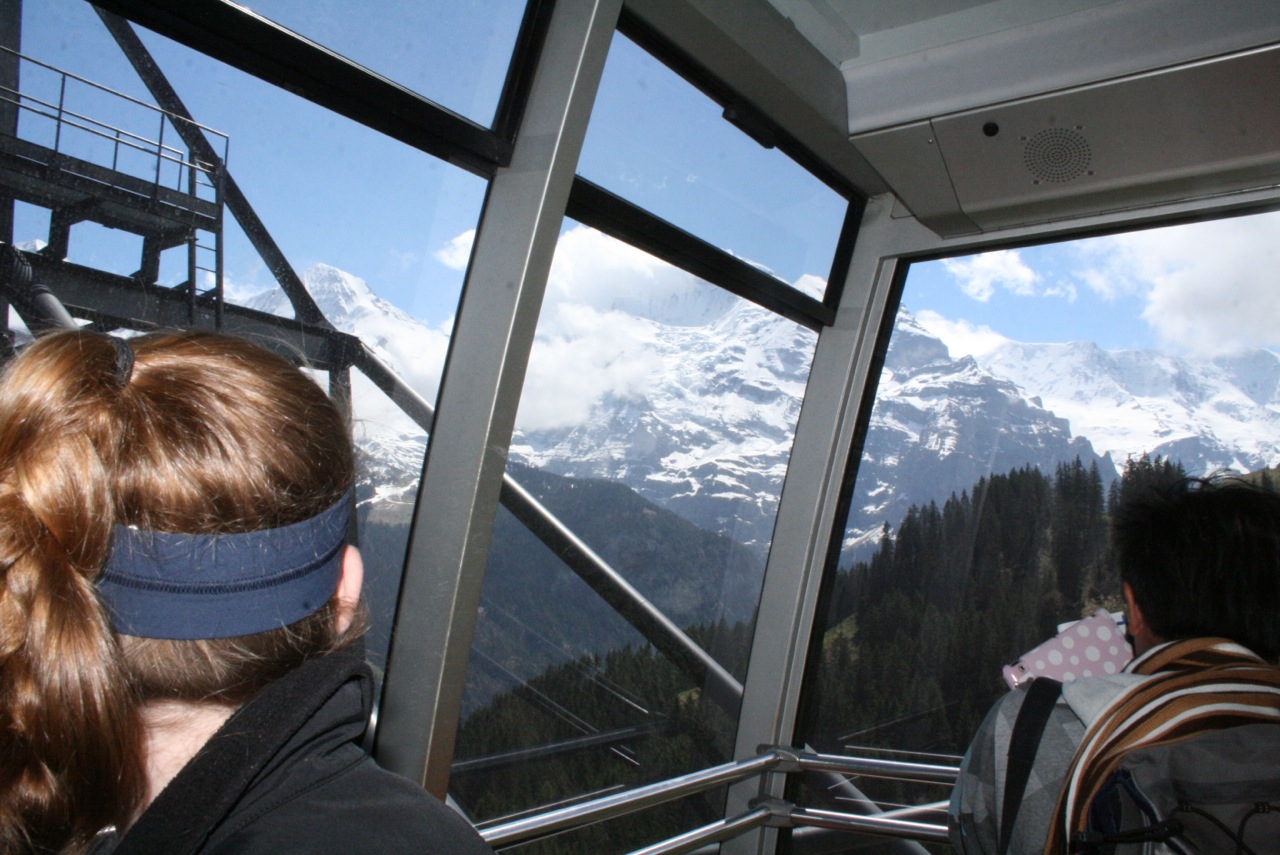 May 14, 2013 – A nice sunny day. Why don’t we go up to 9,745 feet? We were hoping for the weather to clear so we could go to the top of Schilthorn and see the famous Piz Gloria where Telly Savalas held court in the Bond film “On Her Majesty’s Secret Service.” It wasn’t perfect, but good enough! So up we went. The trip starts in the town at Lauterbrunnen – about 10 minutes from our home in Wilderswil – with a tram to Grütschalp. Just doing this tram ride would probably be enough – but this is only the beginning. I was amused by the two 18 year old boys, and their mountain bikes, on the tram with us. At first I thought, “oh that’s cool – they can ride down”… not long into the trip, my thinking changed to “these guys are absolutely nuts!”