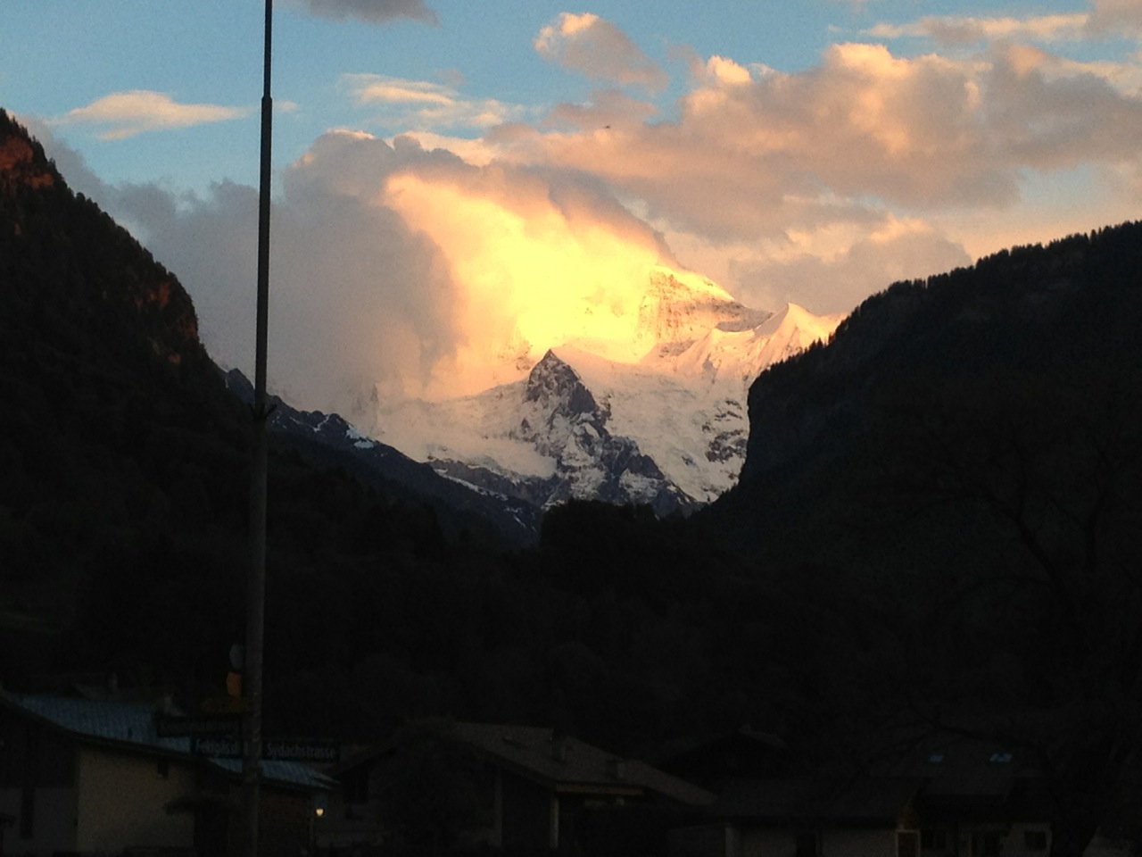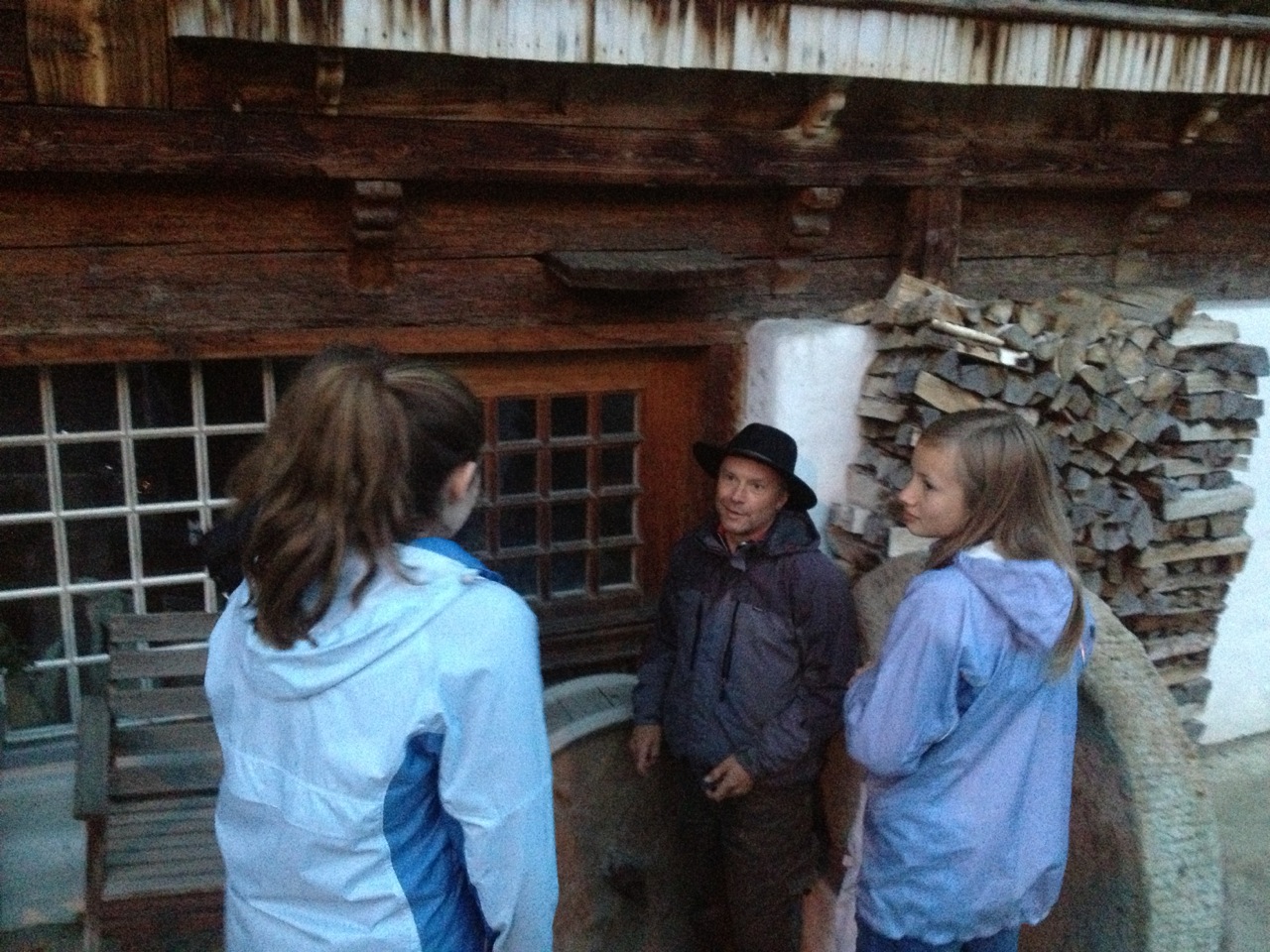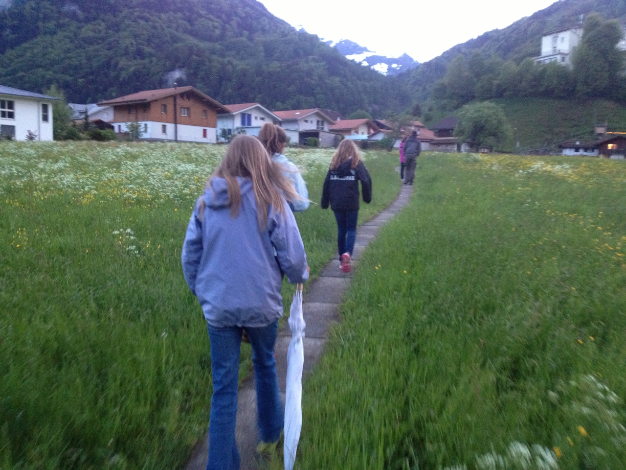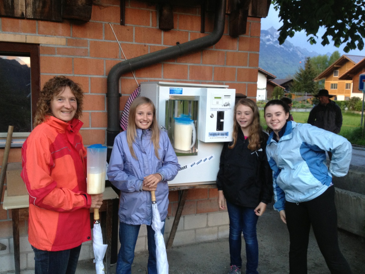 That evening as the sun was setting our hosts, Cindy and Pascal Zeller, along with their daughter Sarah, took us on a little walk around town. We stopped at a local farm and got some fresh, raw milk from a dispenser – one Swiss frank for a litre. The farms are very interesting. The cows spend the winter in the barns attached to the houses – right in town. In early June, when the threat of snow is past, the cows are then led up into the hills where they spend the summer. We learned that the small fields around town are kept long for the cows to graze, and the farmers get very angry if you walk in their fields…